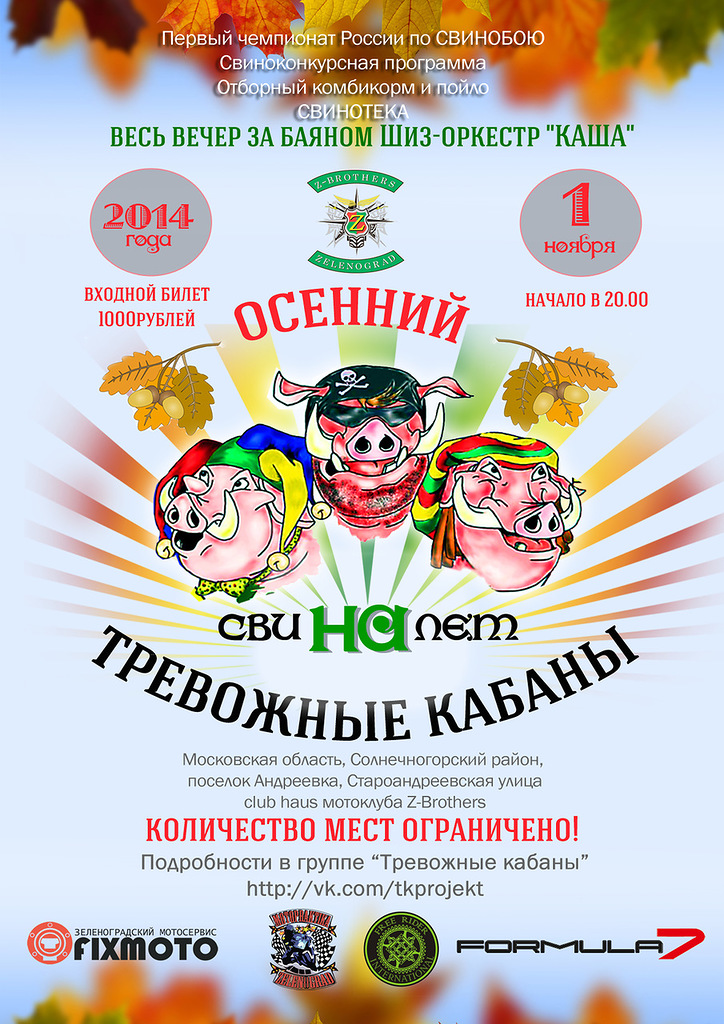 Мотоклуб Z-brothers и Кочующий Телевизионный мотопроект «Тревожные кабаны» приглашают всех на вечеринку «Осенний свиналет», которая пройдет в доме мотокультуры iZBa. В программе живой оркестр, конкурсы, дискотека.