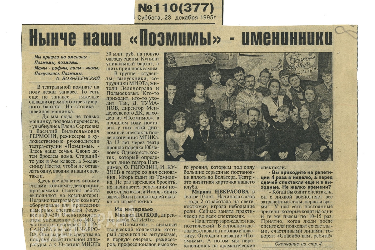 Фрагмент статьи о театре «Поэмимы» в газете «41», 1995 год