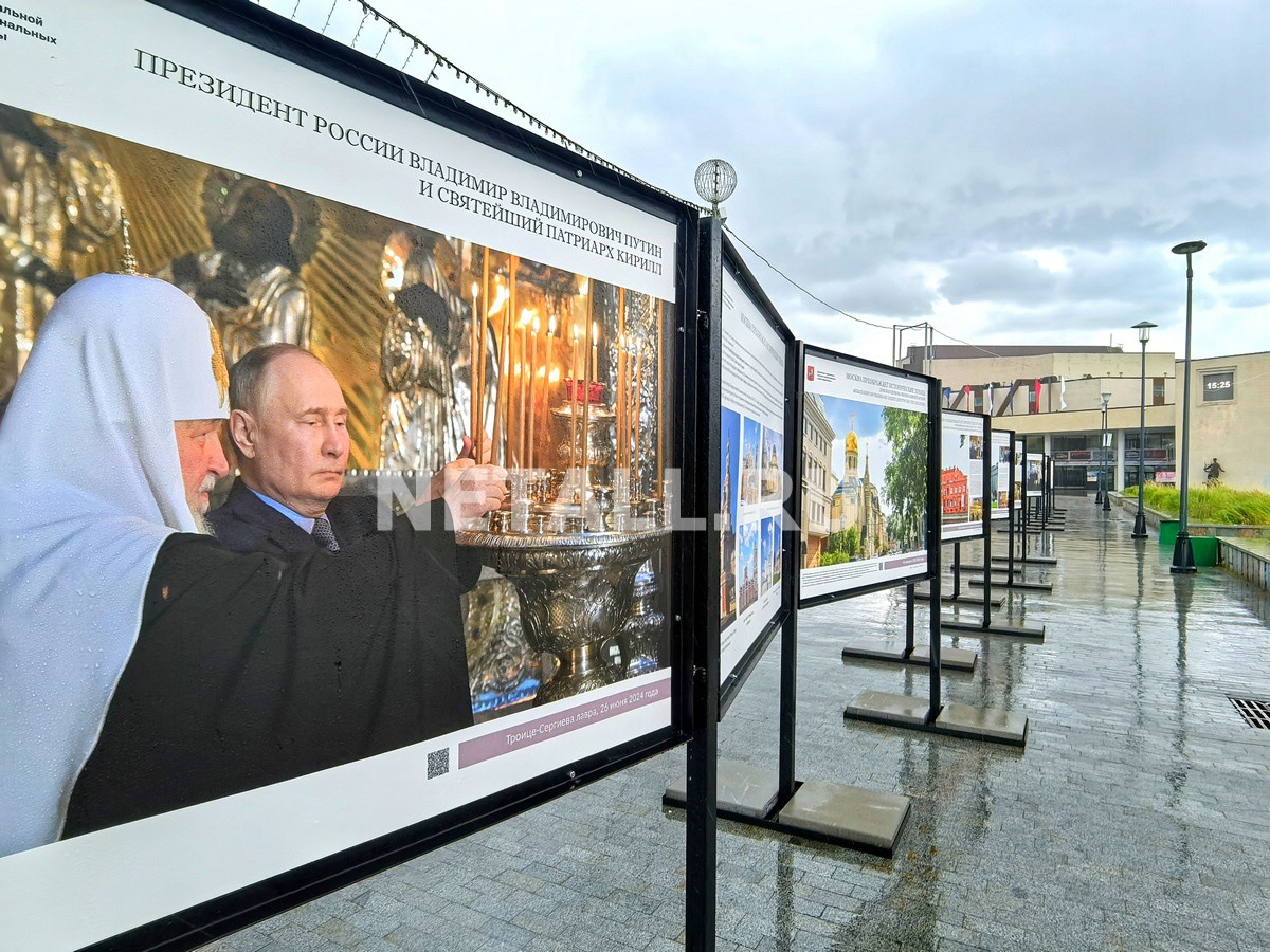 У здания Культурного центра «Зеленоград» развернулась уличная фотовыставка, посвященная православным храмам. Среди прочих в нее вошли кадры с патриархом Кириллом и президентом Путиным.