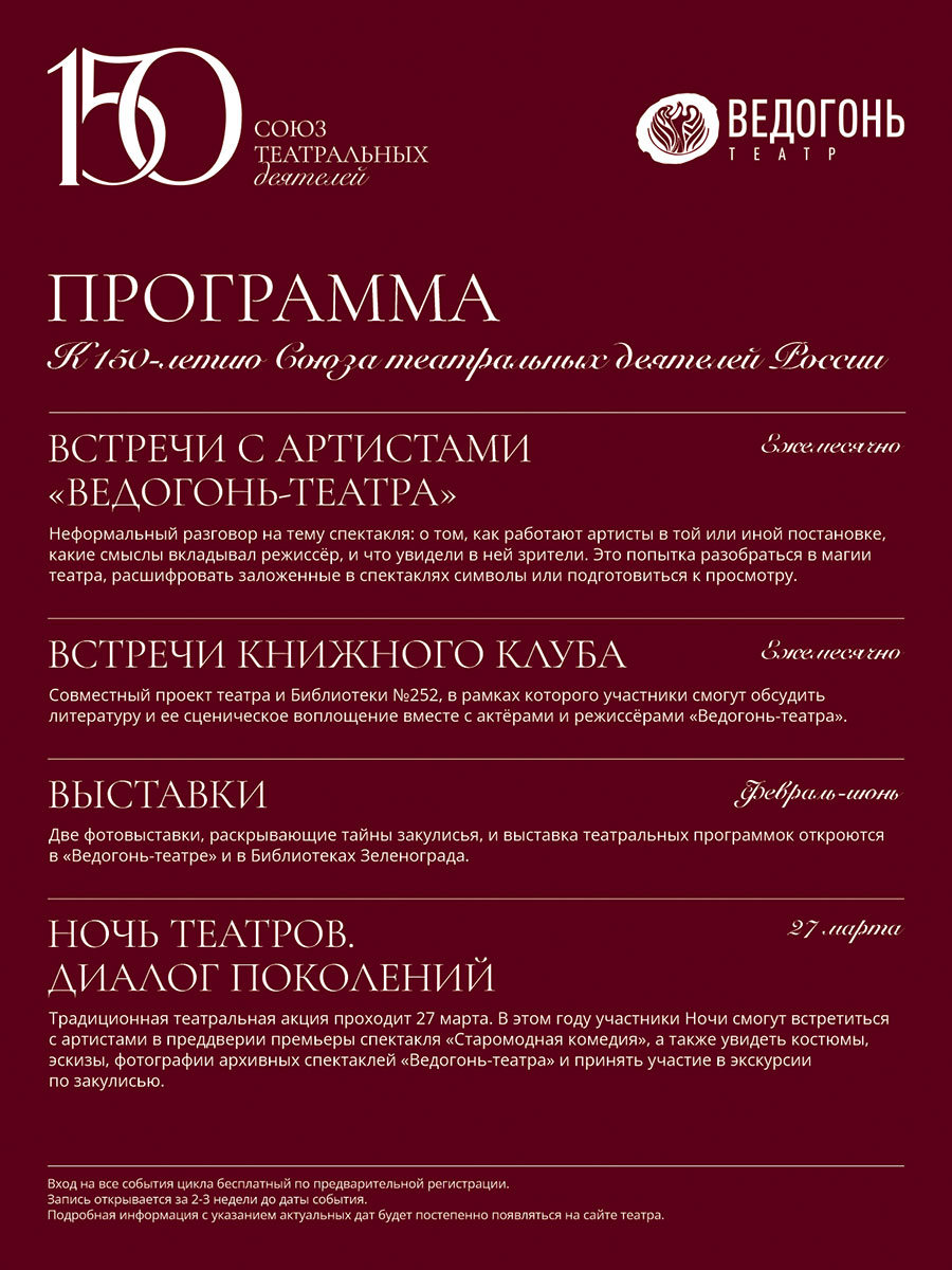 Как сообщили в «Ведогоне», театр подготовил к юбилею обширную программу бесплатных мероприятий, которые будут проходить на разных площадках города. Среди них, в частности, ежемесячные встречи книжного клуба с участием артистов театра в библиотеке №252 в 14-м микрорайоне Зеленограда. На этих встречах специалисты библиотеки, актеры и зрители смогут обсудить литературные произведения и их воплощение на сцене. Первое такое мероприятие пройдет в субботу, 31 января. В этот день Александр Бавтриков расскажет, как раскрываются на сцене произведения Антона Чехова на примере спектакля «Финтифлюшки» ( на мероприятие). В феврале в рамках книжного клуба будут обсуждать «Преступление и наказание» Достоевского. Уже запланированы встречи и на все весенние месяцы, их подробные анонсы пока не публикуются.