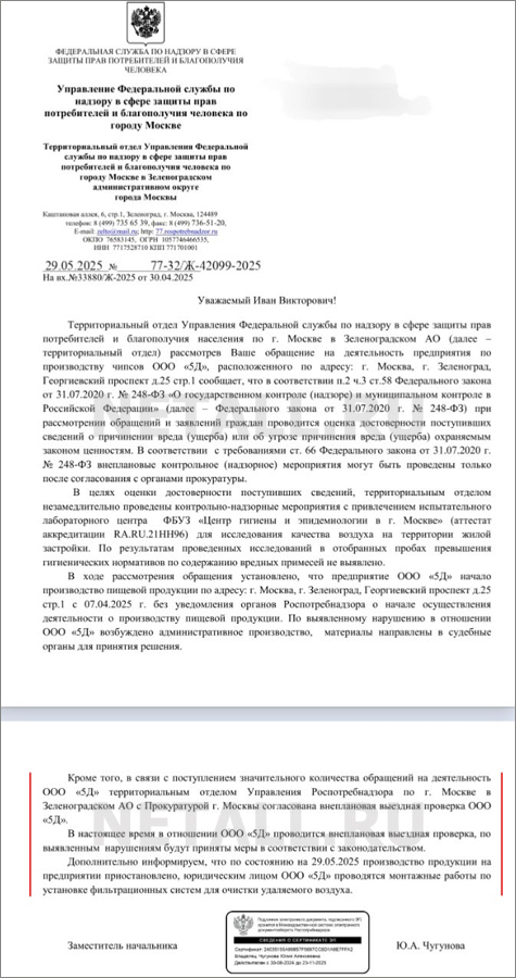 Даты проведения проверки в тексте письма не указываются. При этом в документе говорится, что по состоянию на 29 мая производство продукции на предприятии компании «5Д» приостановлено, а на объекте проводятся монтажные работы по установке фильтрационных систем для очистки удаляемого воздуха.
