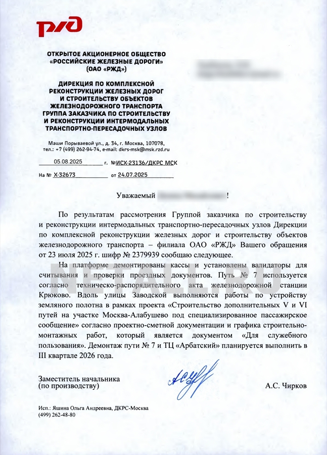 Демонтаж здания бывшего торгового центра «Арбатский» запланирован на третий квартал 2026 года, сообщили в дирекции по комплексной реконструкции железных дорог и строительству объектов железнодорожного транспорта ОАО «РЖД» в ответ на обращение одного из жителей Зеленограда, предоставившего копию документа Инфопорталу. Тогда же планируется разобрать седьмой путь станции Крюково у бывшей первой платформы (ближней к «новом городу»), на который сейчас прибывают некоторые электрички со стороны Москвы. Ранее , что и демонтаж самой платформы намечен на третий квартал 2026 года.