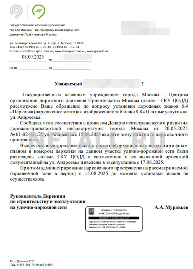 Отметим, что дорожные службы к 15 августа установить знаки платной парковки на улице Андреевка, хотя в приложении «Парковки России» все машино-места на этой дороге с указанной даты отображались как платные. Это подтверждает и официальный ответ ЦОДД на запрос автомобилиста, в котором указано, что знаки и информационные щиты с тарифным планом и номером парковки были размещены на улице Андреевка только 17 августа.