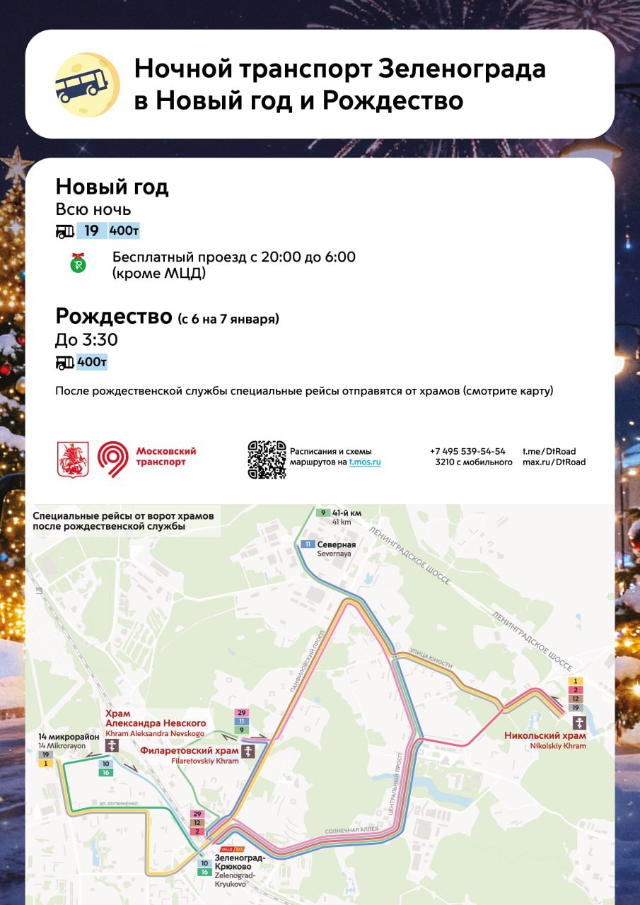 Изменения в работе общественного транспорта ожидаются и на Рождество — в ночь с 6 на 7 января. Маршрут 400Т в эту ночь будет работать до 3:30. Кроме того, к окончанию рождественских служб от храмов Зеленограда отправятся специальные рейсы автобусов: от Никольского храма — автобусы маршрутов 1, 2, 12 и 19, от Филаретовского храма — маршрутов 9, 11 и 29, от храма Александра Невского у 14-го микрорайона — маршрутов 10 и 16.