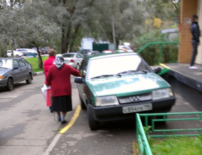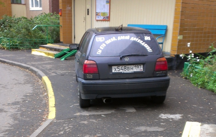 Этот снимок, сделанный читателем kirilllaz, датирован июлем, однако в виду необычности сюжета был удостоен публикации в осеннем номере. ВАЗ-2112 с номерами А 274 КХ 177 RUS у входа в одно из помещений корпуса 1414 рядом с табличкой, призывающей уважать людей, которые ограничены в передвижении.
