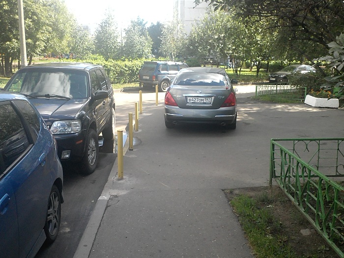 А вечером 28 сентября Awayka заметила, что Volkswagen Passat с номерами В 483 УТ 199 RUS и Volsvo S60 с номерами К 088 ВЕ 150 RUS закрыли проход к пешеходной зоне между корпуса 1425 и 1422, с двух сторон перегороженной «крабами». Причем, по ее словам, между машинами «даже человеку худому протиснуться было невозможно». «Можно только представить радость тех, кто шел по всей длине пешеходной зоны и наткнулся на эти машины в самом конце. Обойти их почти невозможно: по обеим сторонам заборчик, за которыми грязь и прочие прелести, а справа от Volvo достаточно высокий забор, ограждающий мусорные баки», — написала нам читательница.