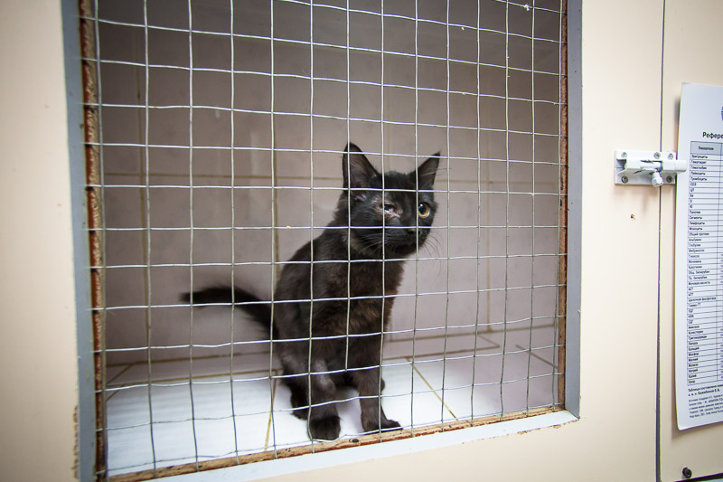 В случае, если после операции животному требуется постоянное наблюдение врачей и специальный медицинский уход, его можно на несколько дней оставить в мини-стационаре при клинике. Для того, чтобы сделать эту фотографию, в один из «вольеров» стационара поместили местного обитателя котенка Джо, несколько месяцев назад прибившегося к клинике POLIVET. Сейчас Джо, которому сердобольные ветеринары успели подлечить больной глазик, активно подыскивают хозяев.