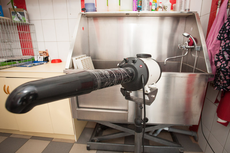 Для сушки шерсти животных используется специальный фен. На заднем плане также видна ванна, в которой можно помыть большую собаку — для многих хозяев крупных животных эта процедура является настоящей проблемой.