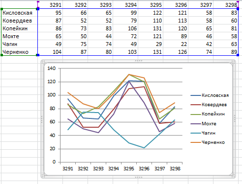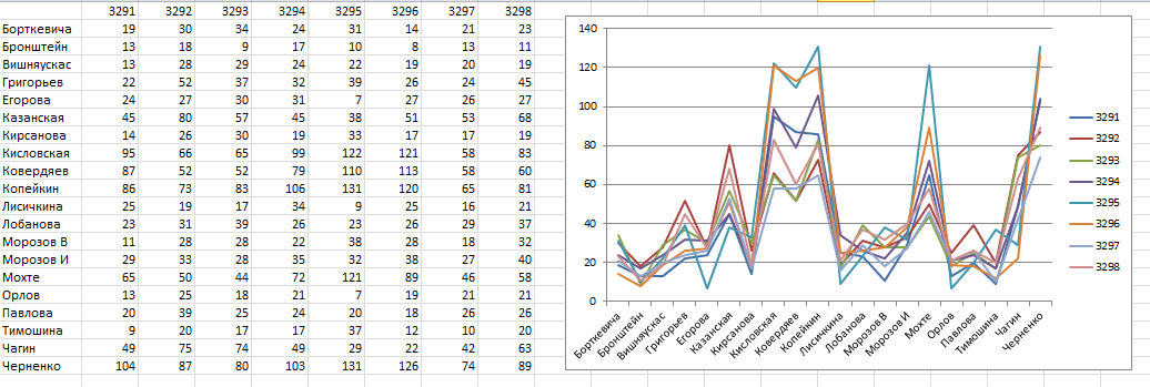 Сводная таблица результатов выборов по избирательному округу № 2 (Старое Крюково) Анализ официальных данных с детализацией по избирательным участкам показал следующее: доля жителей района на нескольких УИК, проголосовавших за кандидатов от Единой России, имеет сильную положительную корреляцию с явкой. Это происходит на фоне уменьшения доли голосов избирателей, проголосовавших за других кандидатов. На Диаграмме 1 сложены голоса всех кандидатов по всем восьми районным участковым избирательным комиссиям. Напротив фамилий определенных кандидатов видны пики предпочтений при голосовании, которые явно бросаются в глаза на двух избирательных участках (