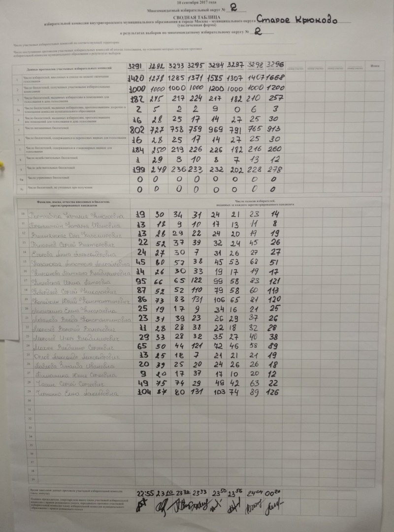 Слова мэра Москвы о честных выборах, педагог и неравнодушный житель 9-го района города Зеленограда, решил проверить на себе. Забегая вперед, скажу, что я принимал участие в предвыборной кампании, не представляя ни одну из партий и не пользуясь имеющимися связями. Это был чистый эксперимент: может ли житель с активной жизненной позицией влиять на судьбу района. Однако, все по порядку. В воскресенье, 10 сентября 2017 года, в Москве прошли выборы в Советы муниципальных округов. Выборы многомандатные. Выбрать можно было от 1 до 5 человек. В Совет проходят пятеро, набравших наибольшее количество голосов. Уверен, Вы знаете о полученных в Зеленограде результатах. Законодательно выборы при 15% явке являются состоявшимися и легитимными. Говорят даже, что на прошлых выборах она была еще меньше. На мой взгляд, жители Зеленограда, игнорируя муниципальные выборы, тоже проголосовали. Они отдали голоса недоверию власти. Доверие же подорвано и восстановить его практически невозможно. А ведь на будущих выборах президента и мэра явку надо поднимать. Легитимность муниципального Совета это одно, а мэра и президента, совсем иное. Общая явка по второму избирательному округу Старого Крюково (9 район Зеленограда) составила 17,18% из 11321 человека. Это больше, чем по Зеленограду. Среднее количество голосов в бюллетене 3,6. Лишь в одной УИК (3295) результат оказался 4,3. О нем будет идти речь ниже. Председатель данной избирательной комиссии Шмелева Галина Петровна. Фамилии председателей и членов УИК можно найти на сайте московской избирательной комиссии {3295, Число погашенных в районе бюллетеней 6494 штуки. 6494 взрослых, дееспособных и правоспособных человек, не пришли на избирательные участки. Большинство из них не верят в честность, проводимых в нашей стране, выборов. И как оказалось не просто так. «Пилите, Шура, пилите.. . Они золотые...»