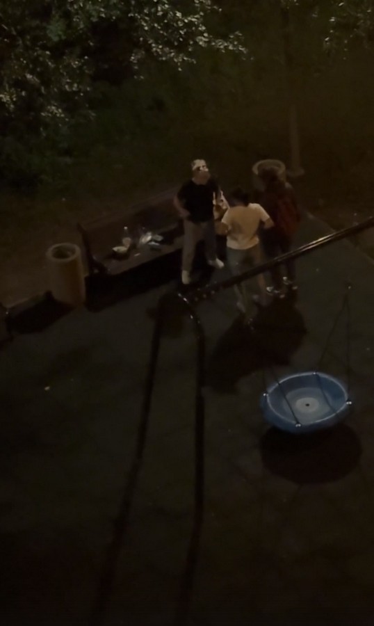 Сегодня, время 00:50 — две барышни и молодой человек в нетрезвом состоянии распивают спиртное на детской площадке. Очередная ночь, когда жители под окнами слушают пьяные бредни».