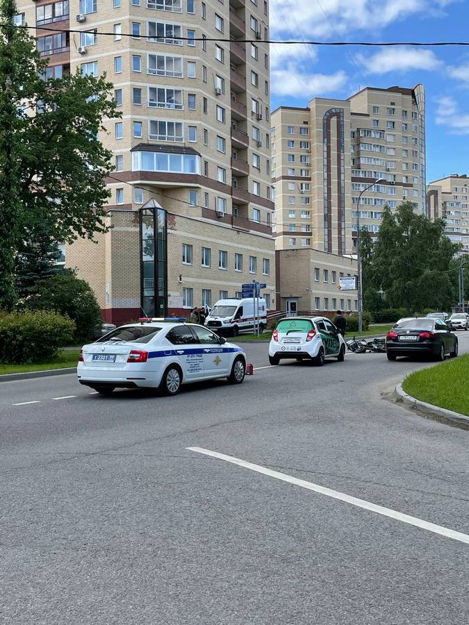 Первый инцидент произошел сегодня, 27 июня, около полудня у корпуса 320. Как видно на фотографиях очевидца с места ДТП, его участниками стали автомобиль Chevrolet Spark с символикой сервиса доставки товаров «Купер», следовавший по улице Юности в направлении Центрального проспекта, и электровелосипед другого курьера с рюкзаком с символикой магазина «Вкусвилл». Обстоятельства происшествия не уточняются. На место ДТП прибыл автомобиль скорой помощи. Судя по кадрам с места происшествия велокурьер не получил серьезных травм.