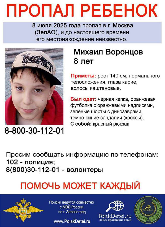 В Зеленограде разыскивают пропавшего 8-летнего жителя 8-го микрорайона Михаила Воронцова.