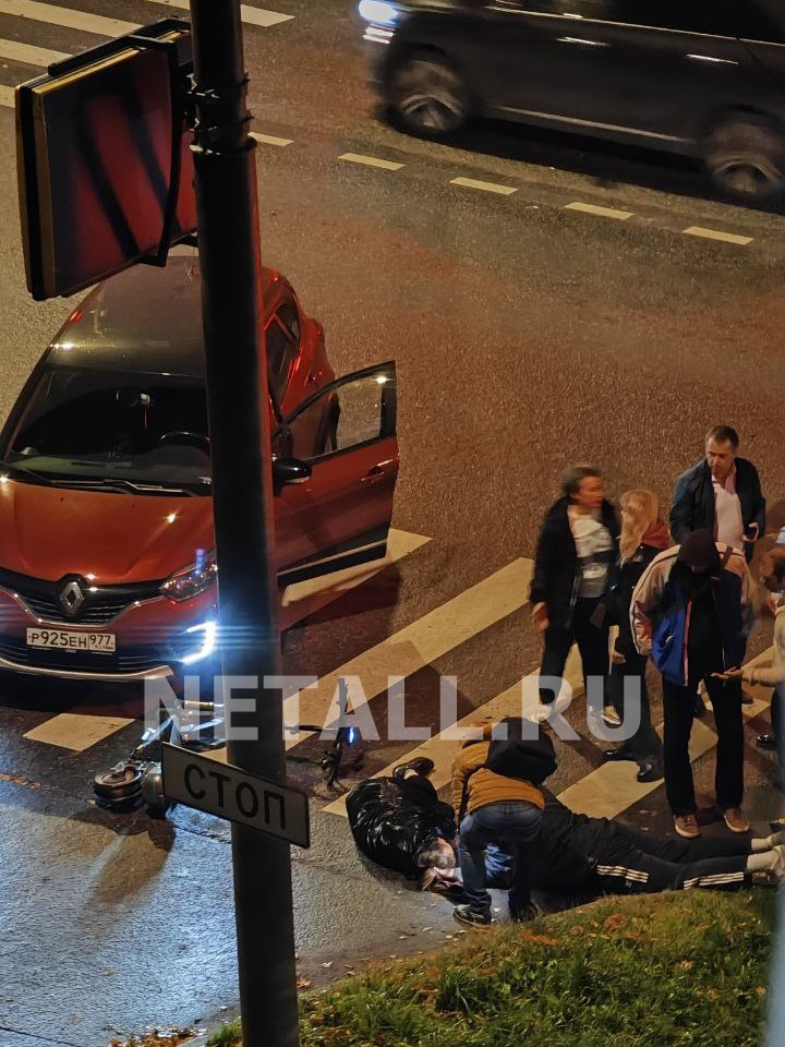 Инцидент произошел сегодня, 9 октября, около 20:30 на перекрестке у корпуса 418. Судя по фотографиям с места происшествия участниками инцидента стали автомобиль Renault Captur, который поворачивал с улицы Летчика Полагушина направо на Березовую аллею, и электросамокат.