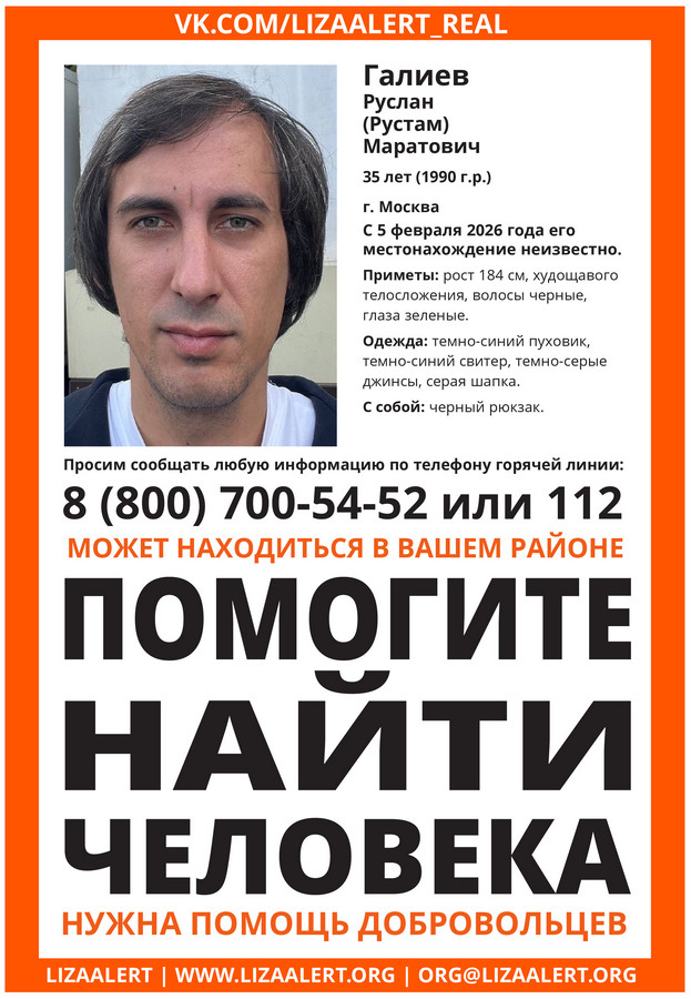 Ориентировка на розыск Руслана (Рустама) Галиева была на сайте волонтерского поискового отряда «Лиза Алерт» во вторник, 10 февраля. В ней указано, что местонахождение мужчины неизвестно с 5 февраля. После появления ориентировки с редакцией Инфопортала связался мужчина, представившийся родственником пропавшего. Он сообщил, что в последний раз Галиева видели на станции Крюково в Зеленограде.