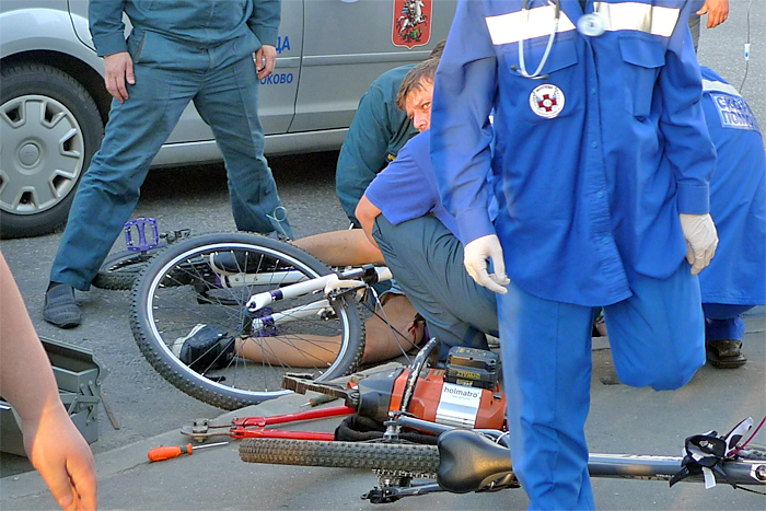 Из-за полученной травмы девушка не смогла самостоятельно покинуть проезжую часть. Прибывшие на место происшествия медики «Скорой помощи» поставили пострадавшей капельницу и стали дожидаться, когда спасатели МЧС при помощи гидроинструмента перекусят ручку на руле. Вскоре на помощь велосипедистке подъехал ее приятель, который перекрыл своей машиной пешеходный переход. После того как воткнувшаяся в ногу деталь была отделена от руля велосипеда, девушку погрузили на носилках в карету «Скорой помощи» и увезли в больницу.