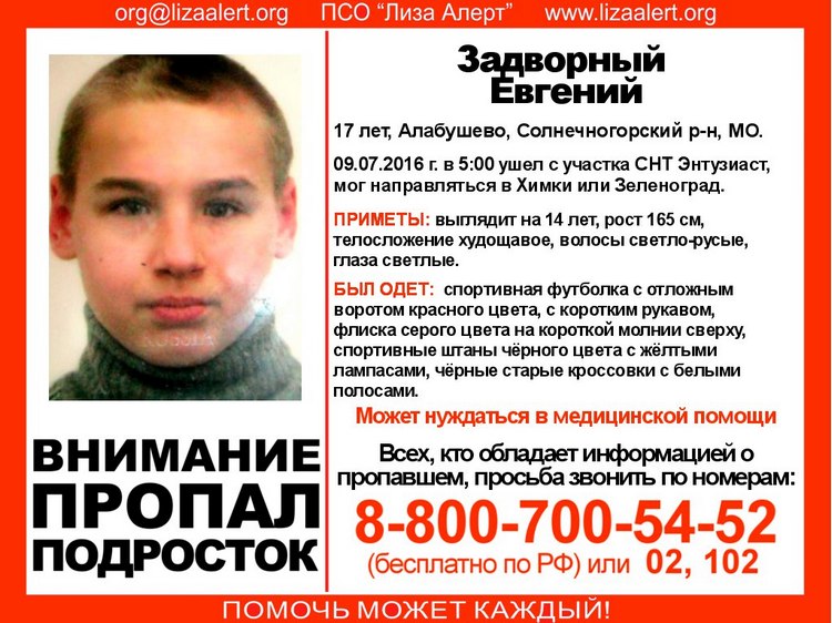 Добавлено 18 июля 2016 года: По сообщению волонтеров отряда «Лиза Алерт», Егор Задворный найден живым.