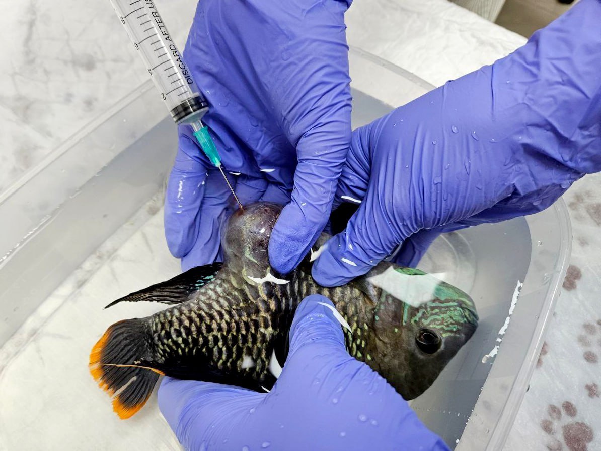 Об историческом случае в практике зеленоградских ветеринаров рассказали в пресс-службе сети государственных клиник «Мосветобъединение». У бирюзовой акары возрастом примерно 5–7 лет начало расти образование на брюшке. За неделю оно сильно увеличилось, рыба стала плохо плавать и испытывать проблемы с дефекацией. Стал заметен риск разрыва опухоли.