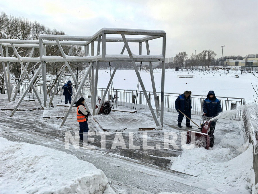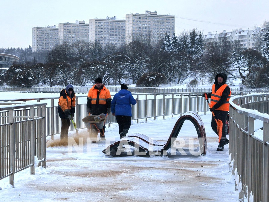 Сотрудники «Автомобильных дорог» нашлись через несколько минут в парке Победы. Там стоял не занятый в этот момент никаким делом погрузчик, а бригада из четырех человек чистила деревянную набережную, сгребая снег даже со скамеек и шезлонгов. Работники коммунальной службы пояснили, что выполняют задания руководства, в первую очередь отрабатывая заявки с портала «Наш город».