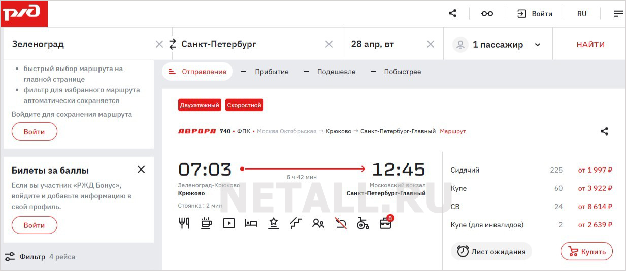 На момент подготовки заметки цены на поездку между Зеленоградом и Санкт-Петербургом в поезде «Аврора» 28 и 29 апреля начинаются от 1997 рублей за сидячее место.