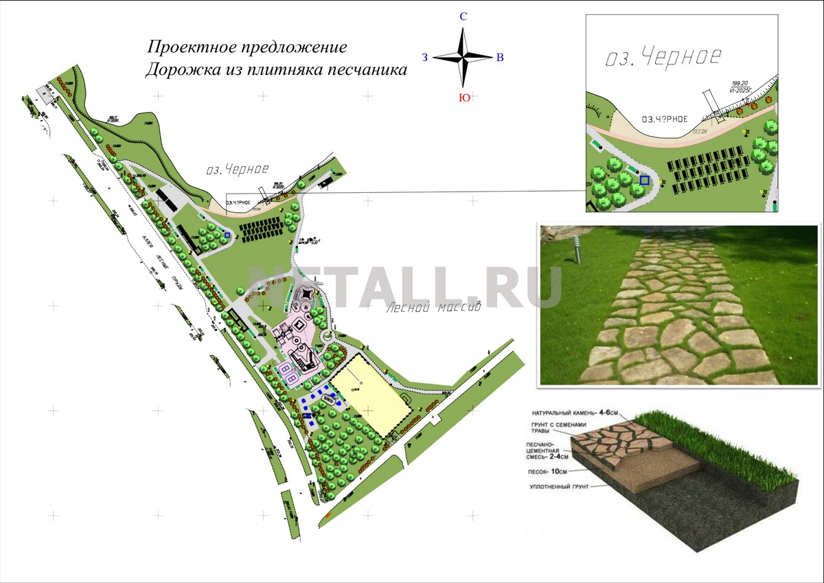 Для решения проблемы засыпания подводных родников, питающих озеро, песком, который сползает в водоем, решено значительно уменьшить площадь песчаного пляжа: покрытие из песка останется только непосредственно у кромки воды, остальная часть пляжной зоны получит травяное покрытие, при этом трава и песок будут отделены дорожкой из плитняка песчаника.