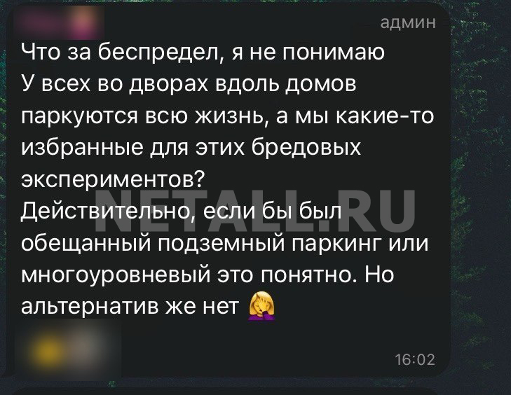 «Нас всех переселили по программе реновации. В проекте района обещали многоуровневые парковки, должны были быть и гостевые стоянки. Но в итоге 3 октября ввели платные парковочные места — около 20 штук на 400 квартир, и повесили в остальных местах знаки "Остановка запрещена". На следующем этапе для нас закроют шлагбаумами и заезд во двор. Нас просто задушили отсутствием парковочных мест! Не знаем, как бороться с этим и куда жаловаться!»
