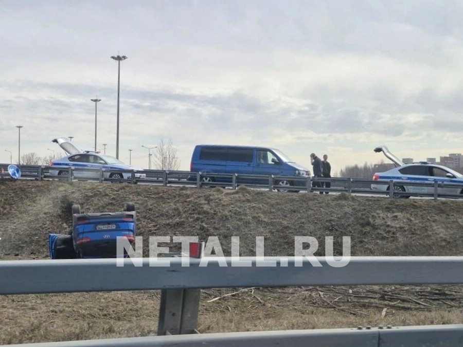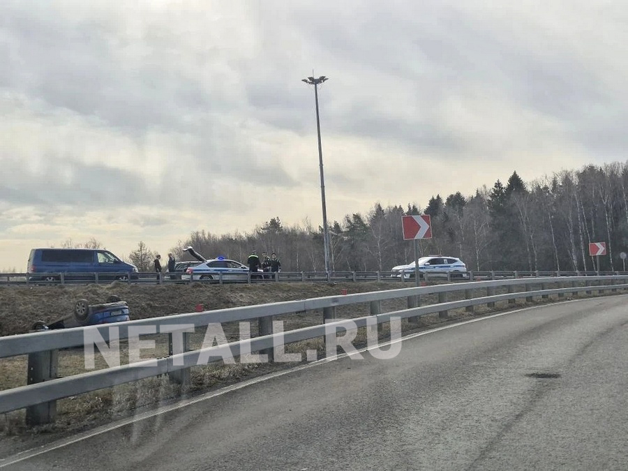 На развязке на 37-м километре Ленинградского шоссе автомобиль вылетел с проезжей части в кювет и перевернулся на крышу.