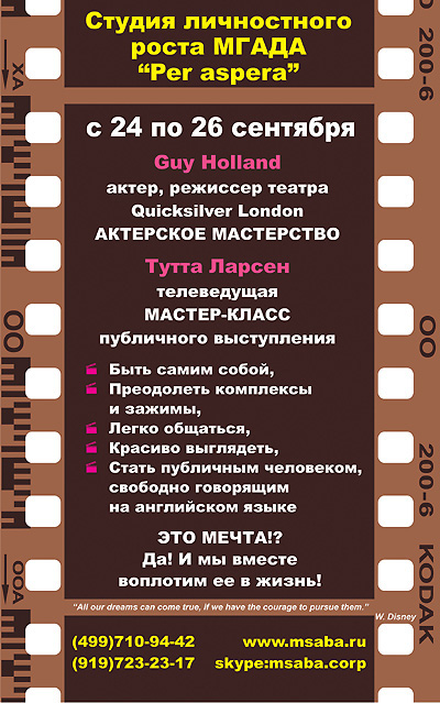 Чтобы не упустить свой шанс воплотить мечты в реальность, надо лишь проявить немножко смелости! Получить более подробную информацию и записаться в студию «Per aspera» Вы можете в Международном отделе МГАДА (кабинет 401), по телефону (499) 710-94-42, по skype msaba.corp или по e-mail per.aspera@miba.ru — Кабахидзе Екатерина Львовна. Спешите! Запись ведется до 17 сентября.
