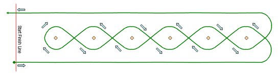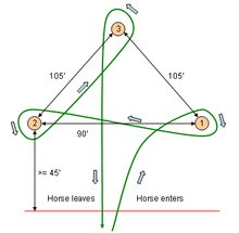 На трассе устанавливают несколько шестов на расстоянии 7 м друг от друга. Вначале всадник скачет на лошади к дальнему концу линии шестов, затем возвращается, проезжая змейкой между шестами, поворачивает и вновь проезжает между шестами, затем скачет галопом к финишу.