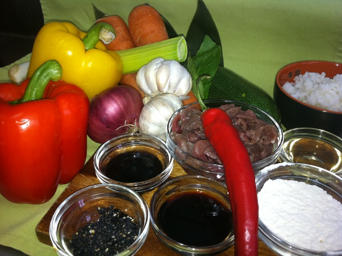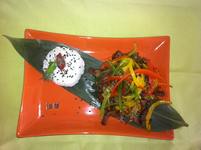 говяжья вырезка 500 г, морковь свежая 1 шт. (средняя),Перец сладкий красный 1/2 шт., перец сладкий желтый 1/2 шт., кабачок цуккини 1/2 шт., чеснок 2 зубчика, масло оливковое 4 ст.л., лук порей 1 шт. (только белая часть), ростки сои 200 г (можно консервированные), чили перец 1-2 шт., кориандр 4 веточки, соевый соус 4 ст.л., устричный соус 1 ст.л., рис китайский круглозерный 200 г, бамбуковый лист 4 шт., обжаренный кунжут 1 ст.л.