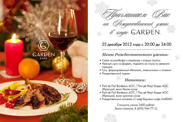 Гастрономическое кафе «GARDEN» приглашает своих гостей 22 декабря на Рождественский ужин.