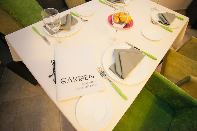 Garden позиционируется как заведение для людей, которые ценят себя, живут с удовольствием и при этом ведут активный образ жизни. А тот, кто заботится о качестве своей жизни, заботится и о качестве еды, выбирая для себя систему питания, позволяющую поддерживать и умножать силы, здоровье и настроение. Мы постепенно подходим к разговорю о еде. Я протягиваю руку к графину с водой, но в стремлении наполнить бокал меня опережает официантка, незаметно вспорхнувшая со своего места, едва я подумал о том, чтобы смочить горло.