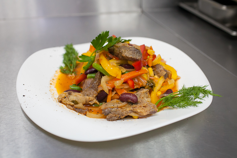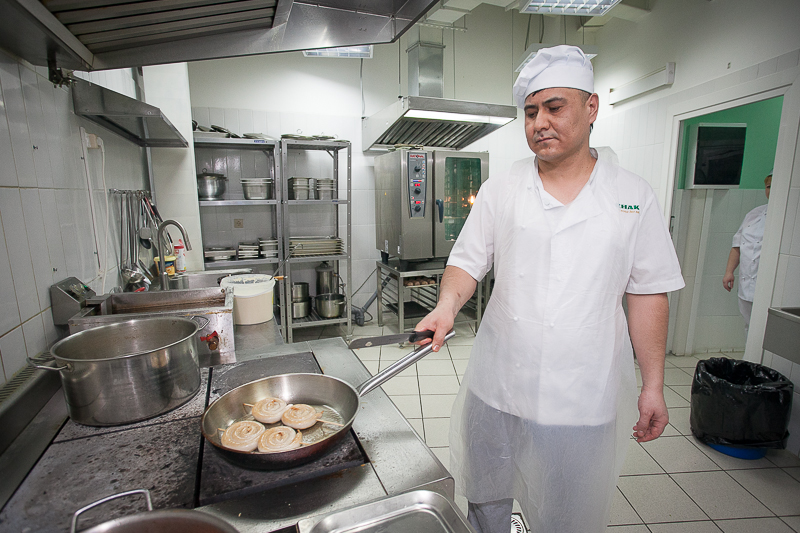 По такому же принципу работает и «горячий» цех, где готовятся супы, гарниры и вторые блюда. Рабочее меню, напечатанное убористым шрифтом и разбитое на несколько колонок, едва умещается на листе формата А4. Харчо, борщ, шурпа, минестрон, щи, рассольник, жаркое, плов, азу, овощи на пару, рагу из кролика, мясо по-французски, зразы, голубцы, жюльены, манты, из рыбы — сибас, дорада, семга, карп... Есть итальянские, арабские, восточные, латинооамериканские блюда. Впрочем, за звучностью названий здесь не гонятся — в «Кнакере» можно купить и обычные блинчики с мясом, и домашнюю котлету, и другие традиционные блюда отечественной кухни.