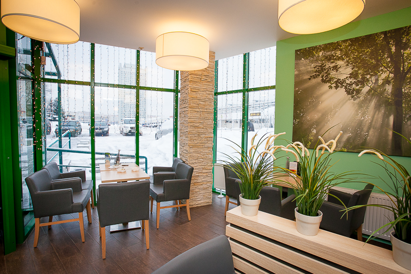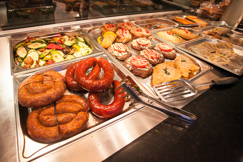 В торговом зале представлены и витрины с результатами трудов поваров «Кнакера» — на выбор покупателей здесь одномоментно предлагается не менее двух видов супов и нескольких десятков салатов, закусок и горячих блюд. При этом супы и вторые блюда хранятся в специальных подогреваемых витринах. Всю эту вкуснотищу можно как взять с собой, так и отведать, не выходя на улицу, — в расположенном под одной крышей с магазином небольшом кафе.