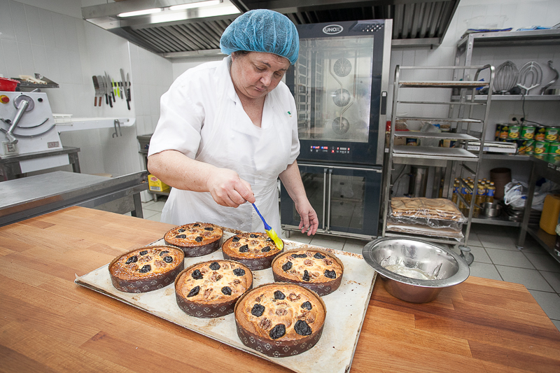 Раньше, чем в холодном и горячем цехах, работа в «Кнакере» закипает только в пекарне. Уже в шесть утра пекари и кондитеры приступают к работе, чтобы к открытию магазина порадовать первых посетителей свежайшей ароматной выпечкой и соблазнительными десертами. Здесь готовят пирожки с самыми разнообразными начинками, слойки, плюшки, сочники и многое другое. Все, что представлено, на «кондитерской» витрине «Кнакера», — продукты собственного производства.