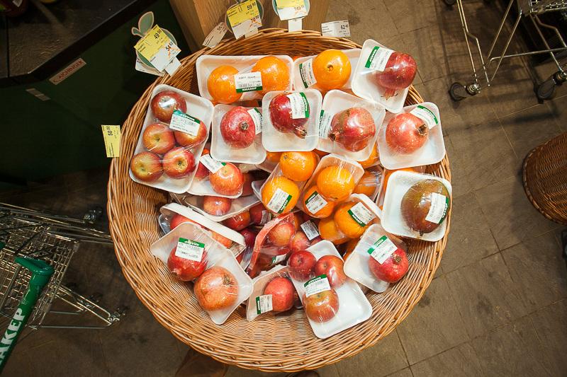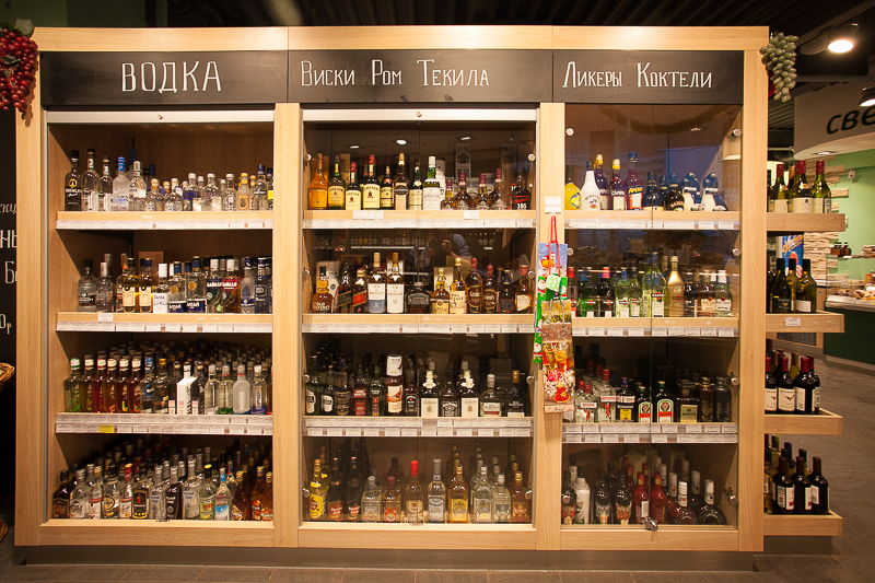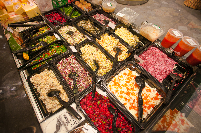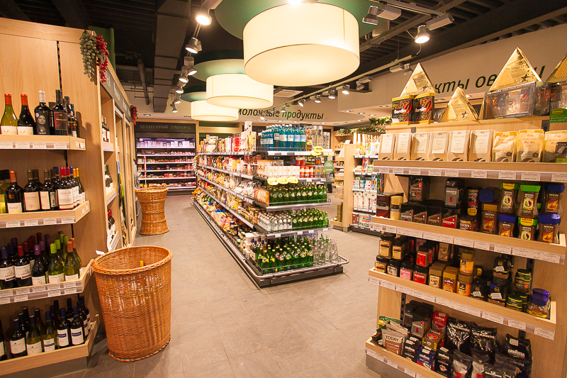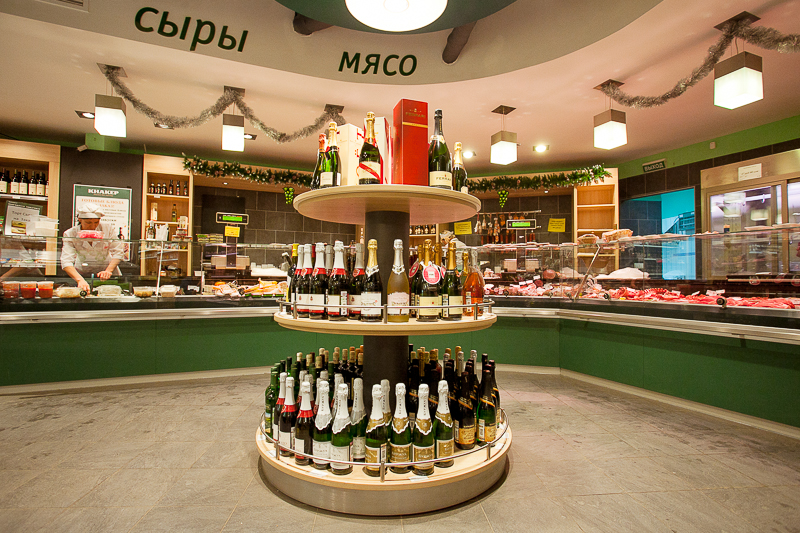 После экскурсии по недоступным обычным покупателям кулинарным цехам спускаемся в торговый зал. Его оформление значительно отличается от того, что мы привыкли видеть в обычных супермаркетах: деревянные стеллажи и мягкое освещение создают не по-магазинному уютную обстановку. Как и положено сумермаркету, «Кнакер» предлагает все виды продуктов, необходимых в хозяйства: и бакалею, и «молочку», и фрукты-овощи, и напитки (в том числе алкогольные).