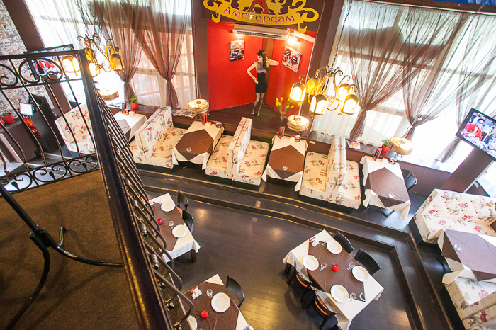 В широком ассортименте сортов разливного пива, конечно, нашлось место «голландцам» Amstel и Heineken. Есть в «Амстердаме» и фирменные коктейли, и настойки собственного приготовления. Последние особенно рекомендуются (и бесплатно подаются) в качестве аперитива к фирменным стейкам. Кроме того, гостям ресторана предлагают широкий выбор кальянов. При этом и некурящие клиенты будут чувствовать себя здесь уютно — для них выделена не просто отдельная зона, а целый VIP-зал.