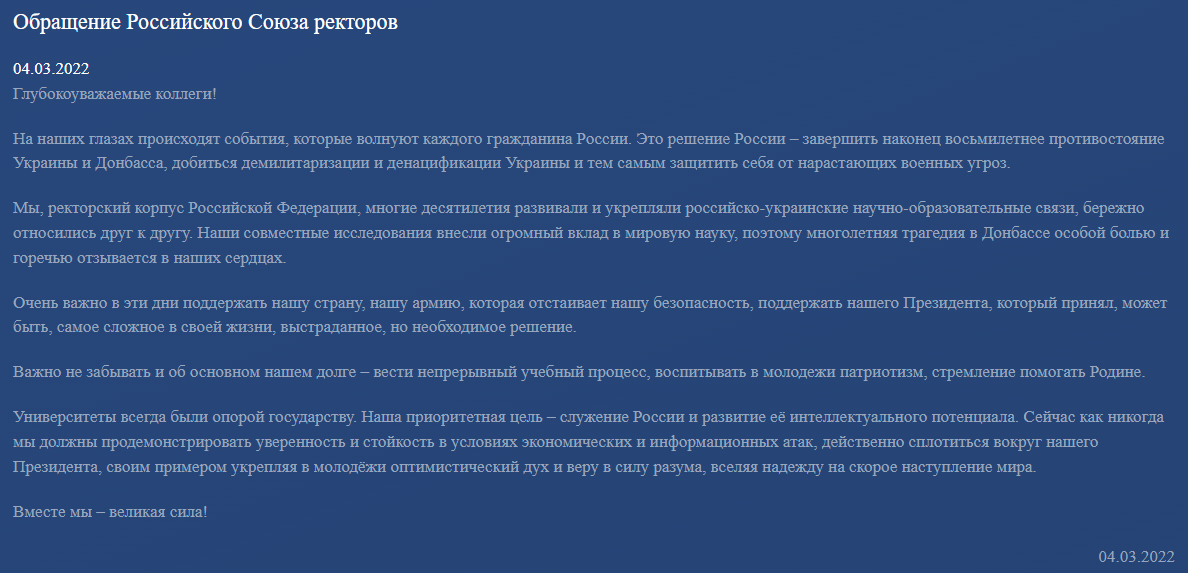 Обращение, датированное 4 марта, на сайте союза. Подписавшие его ректоры выражают в тексте документа уверенность в необходимости «в эти дни поддержать нашу страну, нашу армию, которая отстаивает нашу безопасность, поддержать нашего Президента, который принял, может быть, самое сложное в своей жизни, выстраданное, но необходимое решение». «Важно не забывать и об основном нашем долге — вести непрерывный учебный процесс, воспитывать в молодежи патриотизм, стремление помогать Родине. Университеты всегда были опорой государству. Наша приоритетная цель — служение России и развитие ее интеллектуального потенциала. Сейчас как никогда мы должны продемонстрировать уверенность и стойкость в условиях экономических и информационных атак, действенно сплотиться вокруг нашего Президента, своим примером укрепляя в молодежи оптимистический дух и веру в силу разума, вселяя надежду на скорое наступление мира. Вместе мы — великая сила!» — говорится в обращении.