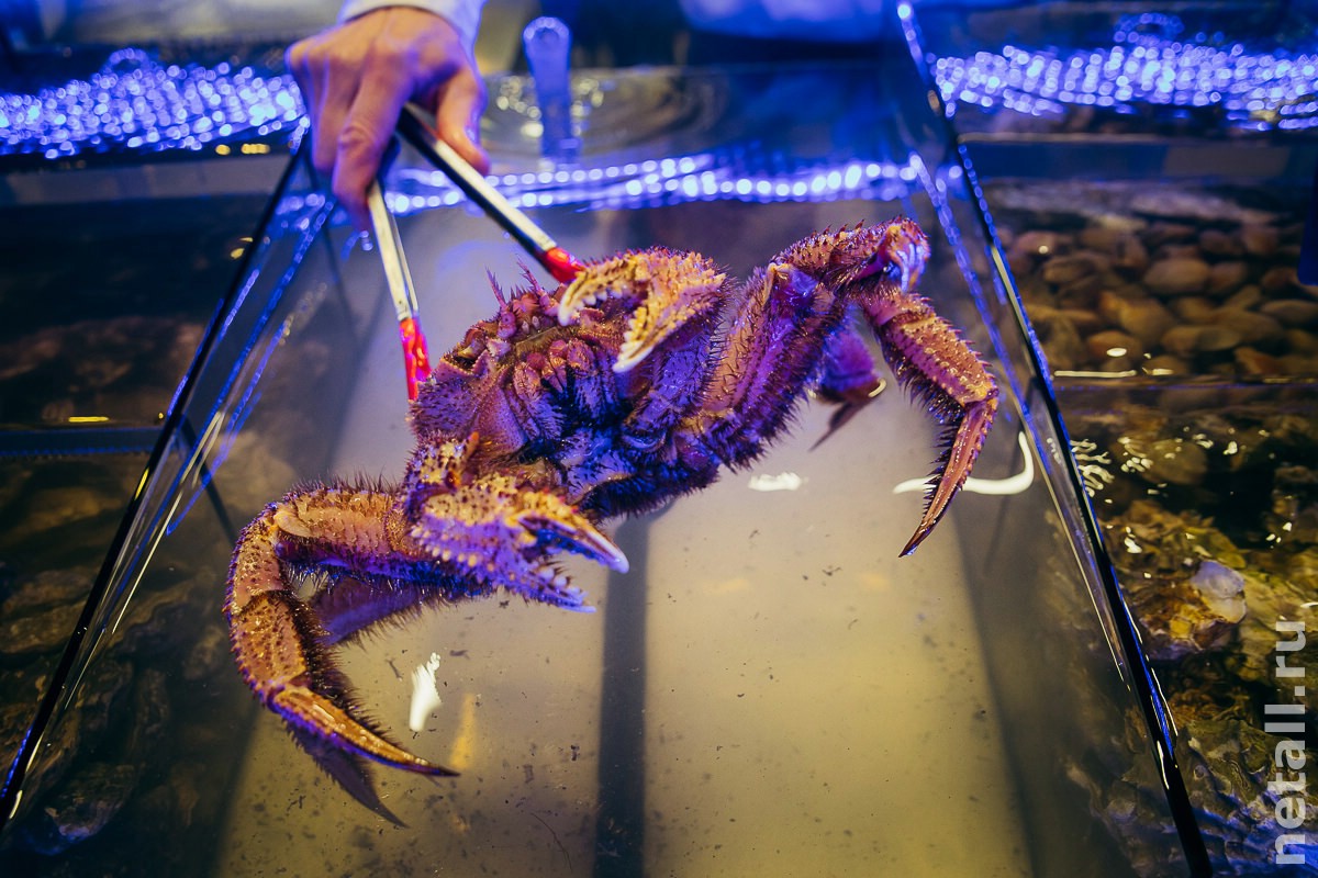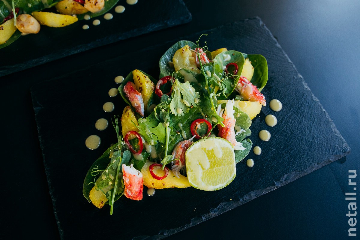 Живых крабов можно заметить в аквариуме «Водяного». Пока их временно нет в меню в качестве отдельного блюда, но, помимо салата, крабов можно попробовать в составе крабкейка.