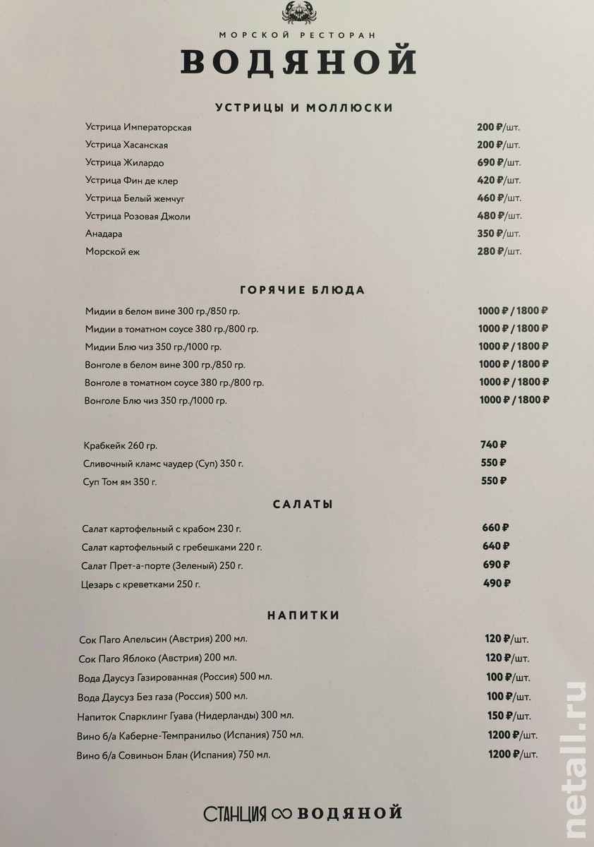 В меню «Водяного» шесть видов устриц, цены на них варьируются от 200 до 690 рублей за штуку. Самые дешевые —дальневосточные устрицы Хасанская и Императорская. Эти устрицы дикие — по выражению Дмитрия Кондрашина, водолазы собирают их, как грибы в лесу. «У них насыщенный морской вкус с ярко выраженной океанской соленостью», — профессионально комментирует шеф-повар. Самые дорогие — французские Жилардо, одни из самых известных в мире. Помимо прочего их отличает клеймо с буквами Gr на створках. Также в «Водяном» представлены устрицы Белый жемчуг, Розовая Джоли и Фин де Клер. Последние — это, согласно характеристике от шеф-повара, «французская классика, которая зайдет всем».
