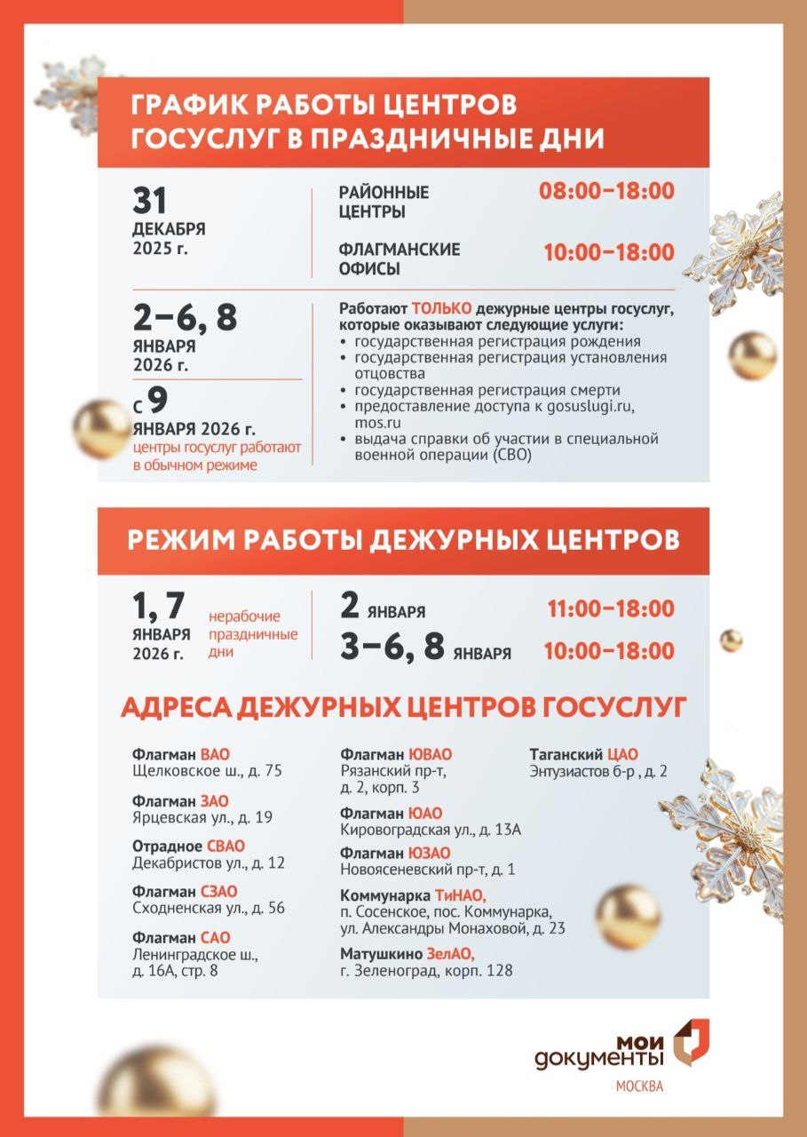 В остальные дни до 9 января в Зеленограде будет работать только центр госуслуг района Матушкино в корпусе 128. 2 января он будет открыт с 11 до 18 часов, с 3 по 6 января, а также 8 января — с 10 до 18 часов.
