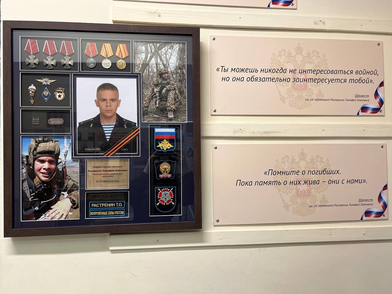 Минувшим летом стало известно, что Тимофею Растренину посмертно звание Героя России. Около года назад в школе №1194 в 15-м микрорайоне, где он учился, открыли посвященную Растренину экспозицию «Я – Шелест! Все, что успел…», созданную при поддержке родных, друзей и сослуживцев погибшего. 5 декабря 2025 года года в честь Тимофея Растренина в школе была «Парта героя».