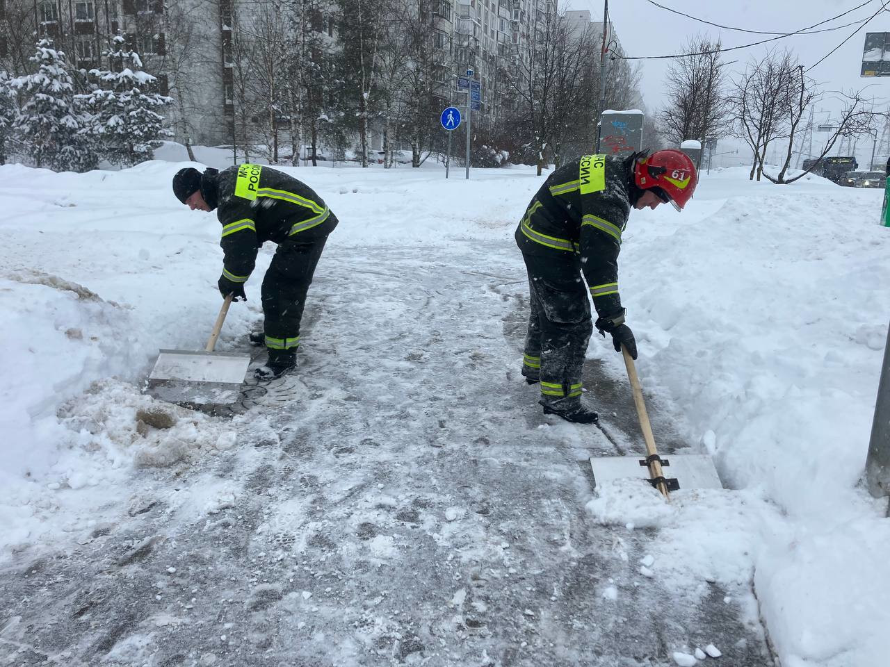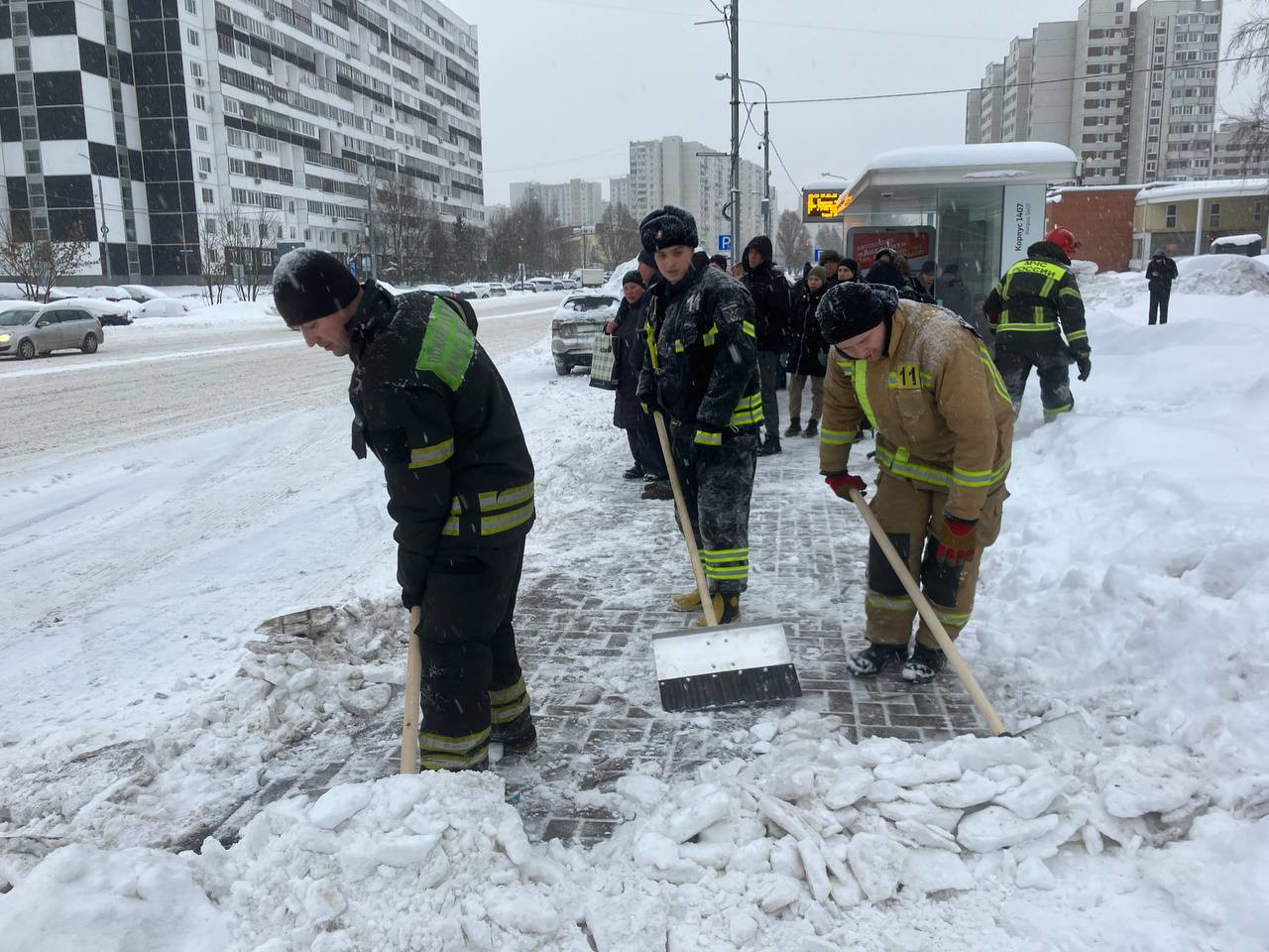 Зеленоградские пожарные в свободное от службы время расчищают остановки, подходы к пешеходным переходам и социально важным объектам.