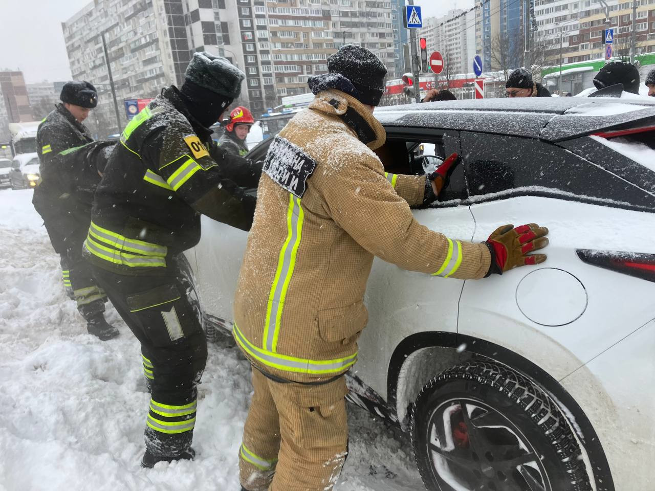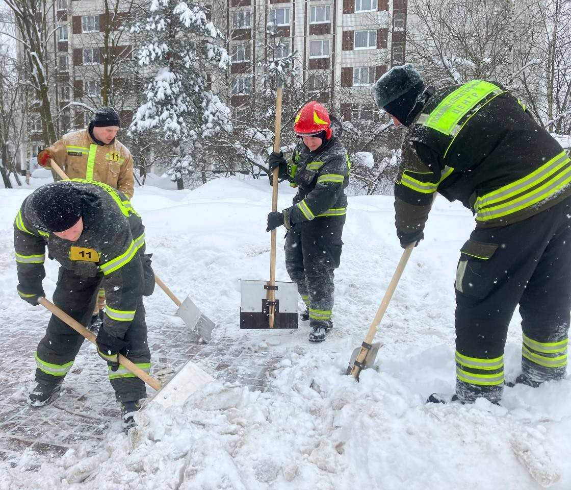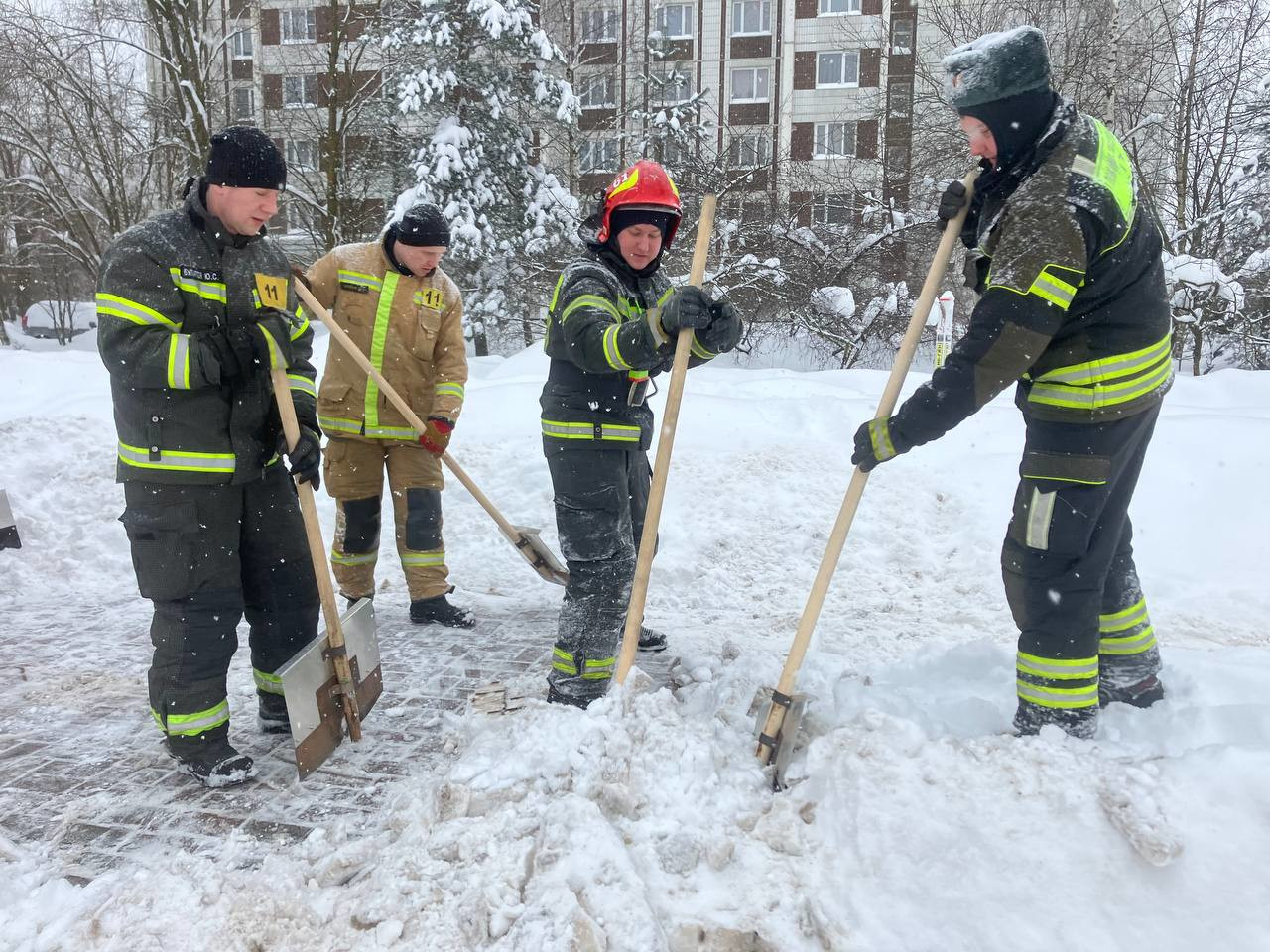 Пресс-релиз проиллюстрирован фотографиями, на которых несколько пожарных расчищают снег у автобусной остановки «Корпус 1407» в 15-м микрорайоне и на подходах к пешеходным переходам на пересечении улиц Логвиненко и Андреевка. Судя по фото также огнеборцы помогли вытолкать из снежного плена легковой автомобиль.