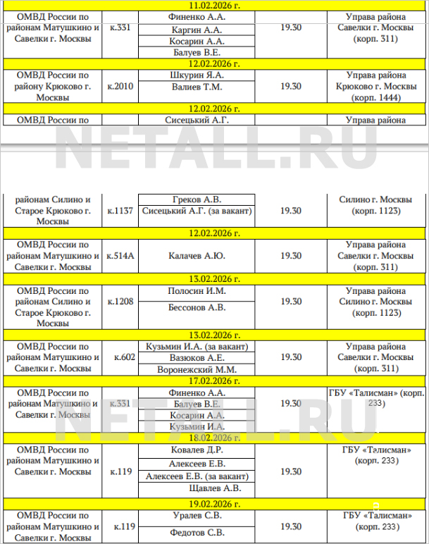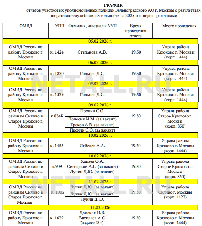 График проведения отчетов опубликовало УВД Зеленограда. Всего в период с 5 по 19 февраля пройдет 17 таких встреч. Все они запланированы на рабочие дни и будут начинаться в 19:30. В большинстве районов встречи пройдут в помещениях управ, в районе Матушкино — в помещении бывшего ГБУ «Талисман» (ныне — Объединение культурных центров Зеленограда) в корпусе 233.