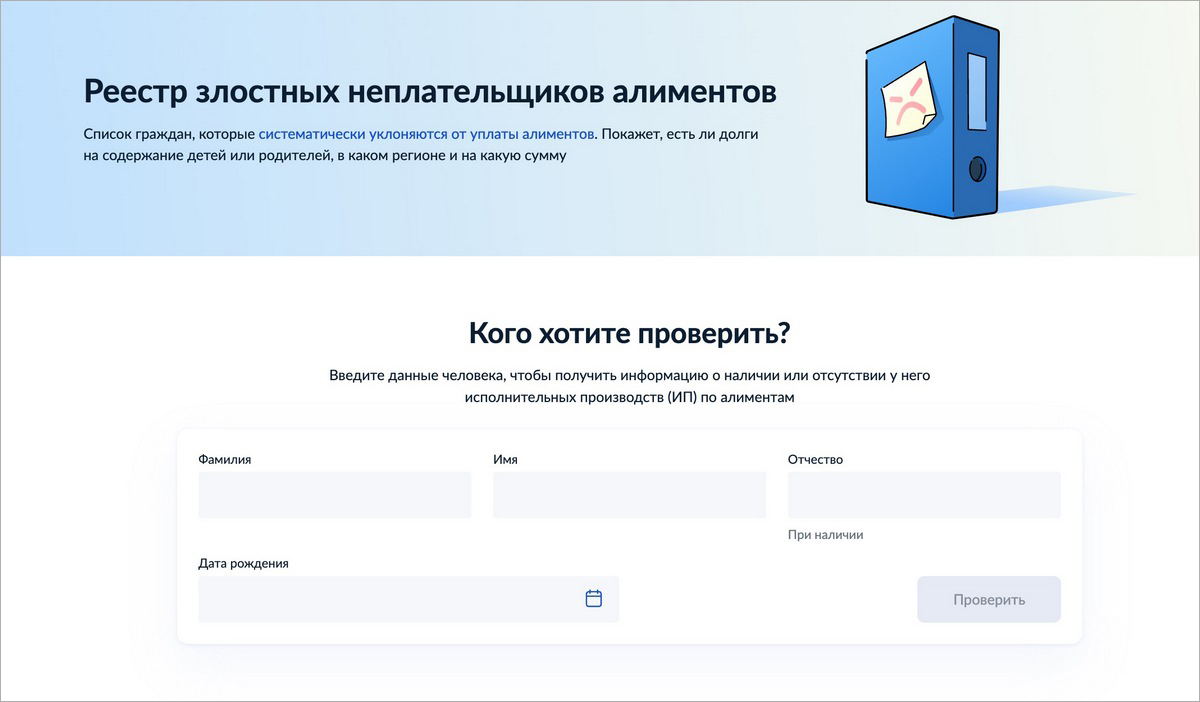 На «Госуслугах» теперь можно проверить, есть ли у человека серьезные долги по алиментам на содержание детей или родителей. Для этого необходимо знать только его фамилию, имя и отчество и дату рождения.