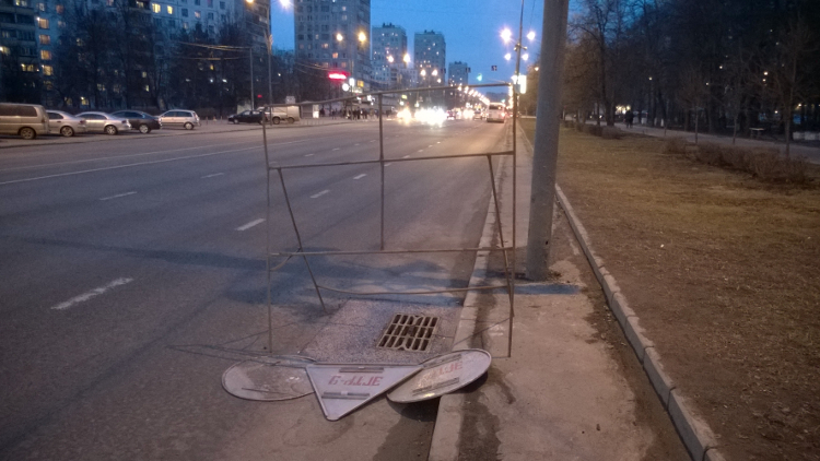 Сегодня (6 апреля — прим. редакции) с началом сумерек чуть не влетел в эту замечательную конструкцию, оставленную дорожниками при ремонте сливного люка. Специально сходил потом сфотографировать! При ближайшем рассмотрении нашел 3 дорожных знака, которые, хотелось бы верить, просто упали от неудачного порыва ветра... Однако, когда я попытался поставить их обратно, выяснилось, что прислонить их банально некуда! Они заметно ниже нижней кромки этого металлического заборчика. Пришлось прислонить только один, надеюсь, это позволит заметить сие творение дорожников и избежать аварии еще кому-то!