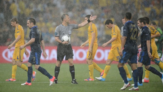 «Нет-нет, футбол не отменили, это просто реклама дождя», — такая запись появилась в аккаунте телеканала «Дождь» «ВКонтакте», когда 15 июня через несколько минут после начала матча Украина — Франция главный судья принял решение увести команды с поля из-за тропического ливня, обрушившегося на «Донбасс Арену» в Донецке. Принцип «матч состоится в любую погоду» уступил буйству стихии примерно на час, в течение которого футболисты находились в раздевалках. Когда игра продолжилась, выяснилось, что родные стены и небеса в этот день не сумели помочь сборной Украине — подопечные Олега Блохина уступили французам со счетом 0:2.