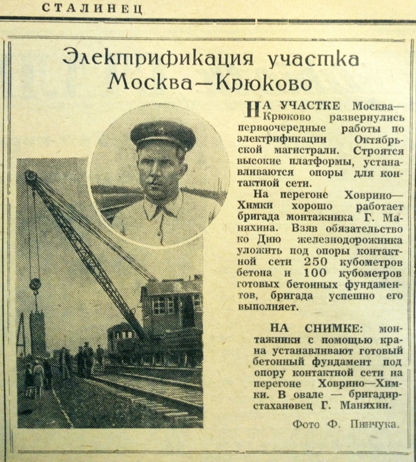 Об электрификации участка Москва–Крюково «Сталинец» сообщал редко. 8 июня дал заметку с участка Ховрино–Химки, где хорошо работала бригада монтажника-стахановца Г. Маняхина.