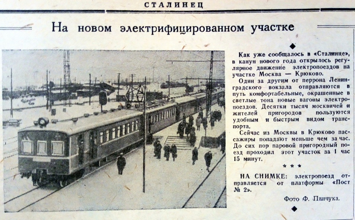 «Вечерняя Москва» сообщила о начале электрификации участка Москва–Крюково в № 22 от 26 января 1950 года, затем давала короткие сообщения о проведении работ 15 мая (№ 113), 27 мая (№ 124), 24 июня (№ 148), 29 июля (№ 178), а о пуске электропоездов информировала читателей в третьем номере 1951 года, вышедшем 4 января.